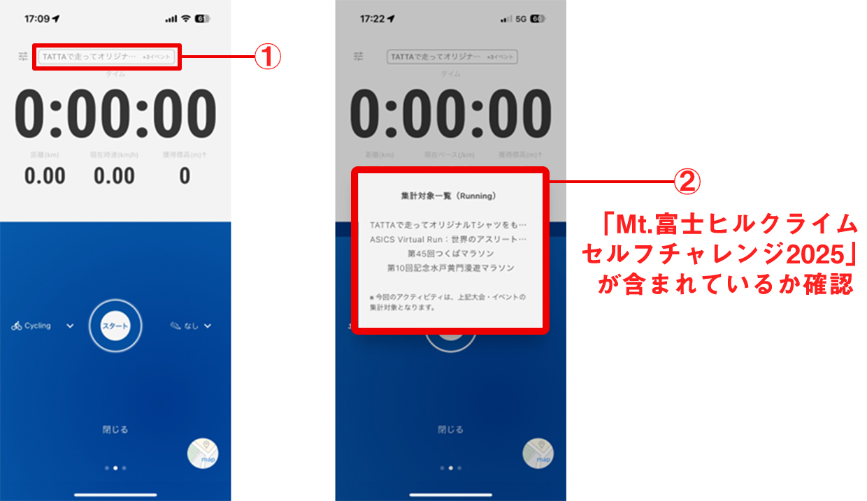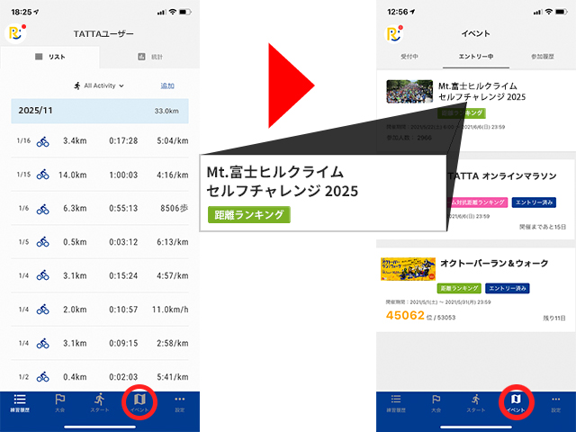 TATTAアプリ内[イベント]をタップし、「Mt.富士ヒルクライム セルフチャレンジ 2025」が表示されているか確認してください。表示されていれば準備OK!(エントリー手続後、即日反映されます)