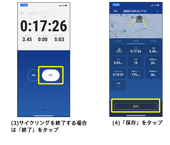 期間内にTATTAを起動し、[スタート]をタップして走ります。走行後、[■][終了]をタップし、最後に[保存]をタップしてください。これで走行距離が保存されます。